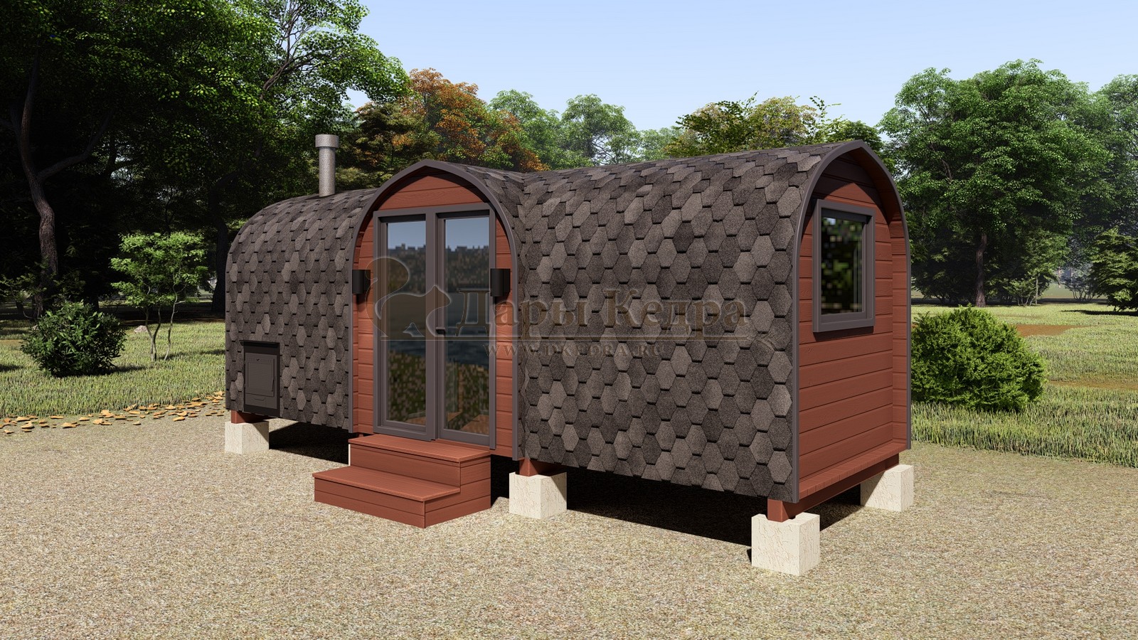 Баня-бочка буханка из кедра с козырьком (все размеры) Баня-буханка более просторная за счет увеличенной высоты потолков и ровного пола. Козырек не только украшает баню, но и защищает оставленную обувь от дождя. Лавочки из кедра находятся по всей длине бани-бочки с обеих сторон. Печь расположена в парилке около дальней стены. Время растопки такой бани не превышает 30 минут. В зависимости от выбранного размера баня-бочка буханка с козырьком имеет следующую комплектацию: Баня-бочка буханка 2,5 метра - парилка; Баня-бочка буханка 3,5 и 4,5 метра - раздевалка, парилка; Баня-бочка буханка 5,5 метров - раздевалка, парилка, моечная. По вашему желанию ее можно укомплектовать печью с внешней загрузкой, благодаря которой весь мусор вовремя топки остается на улице. Баня-бочка буханка не требует полноценный фундамент, поэтому при необходимости ее можно перенести в другое место. Обращаем Ваше внимание, что в стандартную комплектацию бани входят полки открытого типа в парной с обеих сторон. Дополнительно можно заказать полок закрытого типа или лавку! Кедр обладает ароматическими свойствами. Он не деформируется и влагоустойчив, при правильном уходе за деревом на нем не развиваются грибки и плесень.