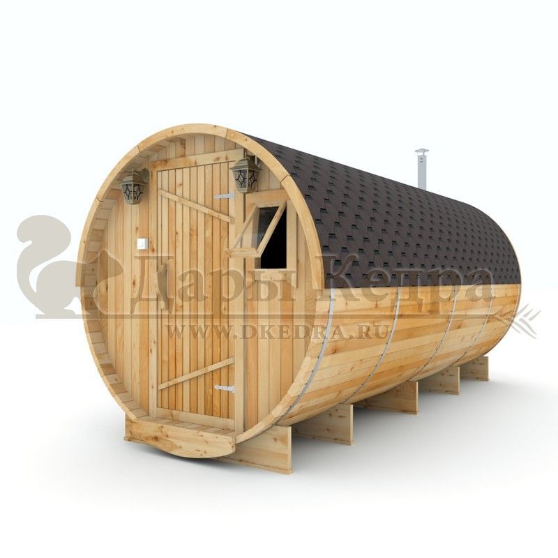 • Баня-бочка круглая из кедра с козырьком (все размеры) Это изделие круглой вытянутой формы. Козырек не только украшает баню, но и защищает оставленную обувь от дождя. Лавочки из кедра находятся по всей длине бани-бочки с обеих сторон. Печь расположена в парилке около дальней стены. Время растопки такой печи не превышает 30 минут. В зависимости от выбранного размера круглая баня-бочка с козырьком имеет следующую комплектацию: Круглая баня-бочка 2,5 метра - парилка; Круглая баня-бочка 3,5 и 4,5 метра - раздевалка, парилка; Круглая баня-бочка 5,5 метров - раздевалка, парилка, моечная. По вашему желанию ее можно укомплектовать печью с внешней загрузкой, благодаря которой весь мусор вовремя топки остается на улице. Круглая баня-бочка не требует полноценный фундамент, поэтому при необходимости ее можно перенести в другое место. Обращаем Ваше внимание, что в стандартную комплектацию бани входят лавки в парной с обеих сторон. Дополнительно можно заказать полок открытого или закрытого типа! Кедр обладает ароматическими свойствами. Он не деформируется и влагоустойчив, при правильном уходе за деревом на нем не развиваются грибки и плесень.