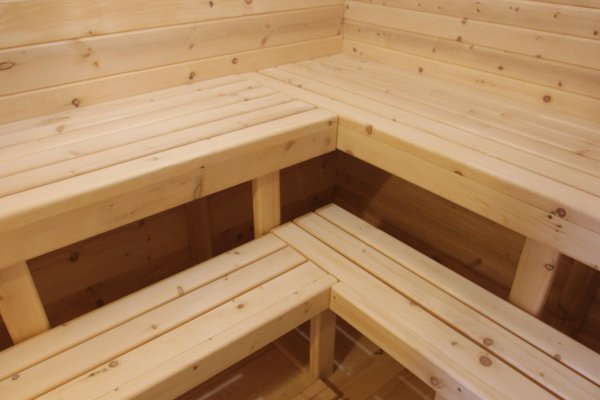 Двухуровневый полок г-образной формы может быть установлен только при боковой установке печи как с внешней загрузкой (улица, раздевалка, моечная), так и с внутренней загрузкой в парной.