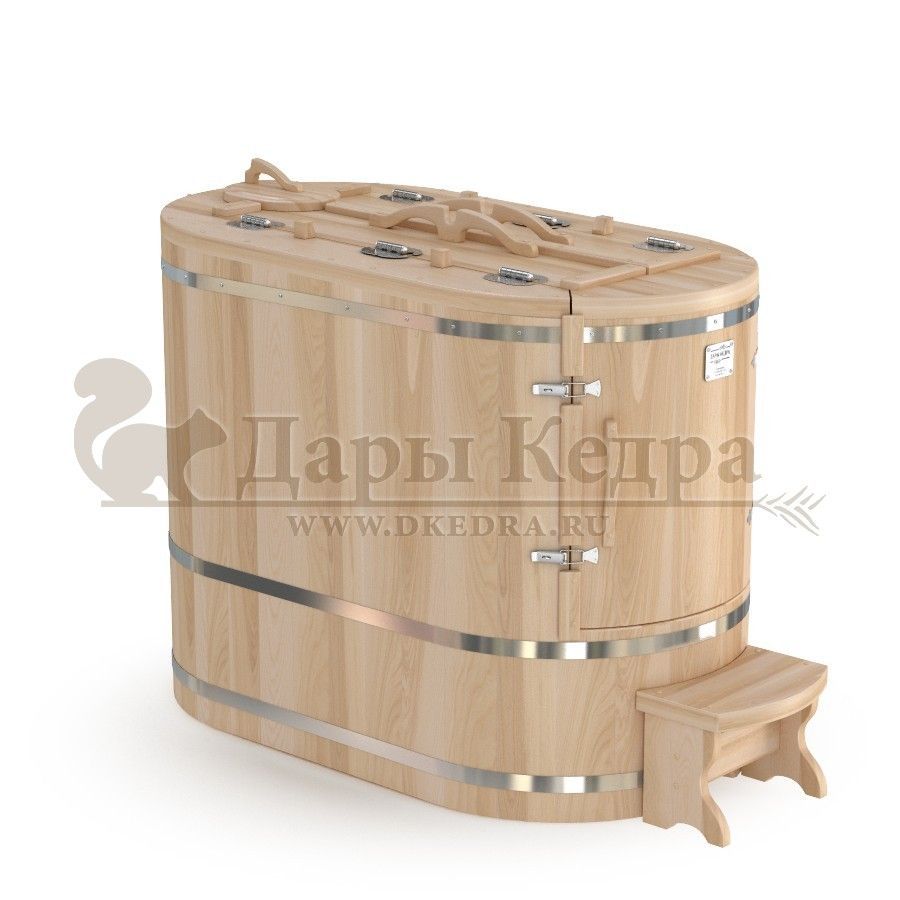 • Кедровая бочка (фитобочка) овальная со скосом «Классическая» Овальная фитобочка из кедра - это мини парная, которую можно использовать не только в спа-салонах, но и дома. Овальная модель более просторна и удобна в использовании. Толщина стенок составляет 25 мм. Верхний скос делает положение головы более комфортным и улучшает обзор. Она оборудована откидными створками, дверцей и отверстием для головы. Во время парения человек сидит внутри кедровой бочки, а голова находится снаружи. Благодаря этому исключается возможность перегрева. Подлокотники из кедра, встроенные ручки на створках и двери делают эксплуатацию более удобной. Парение в фитобочке благотворно влияет на организм в целом: повышается иммунитет, выводятся шлаки и токсины, улучшается работа органов тела и состояние кожи.