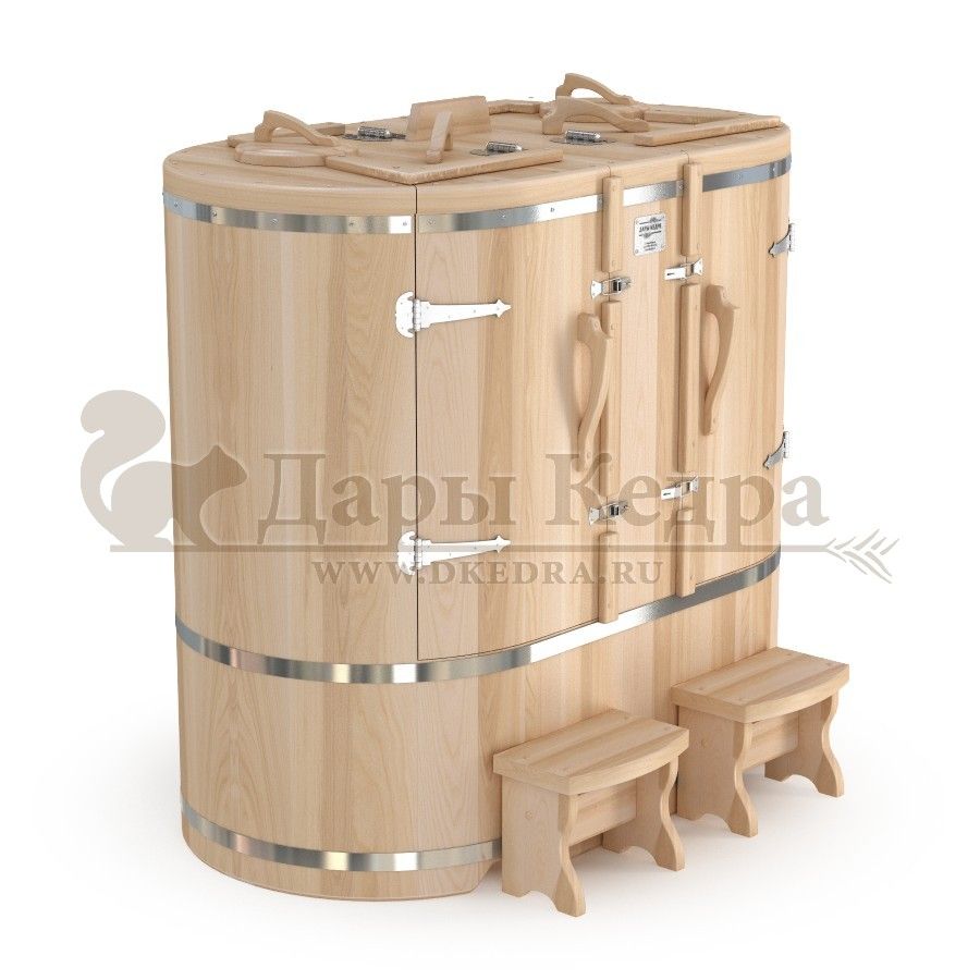 • Кедровая бочка (фитобочка) двухместная «Классическая» Двухместная фитобочка из кедра - это парная, в которой удобно принимать процедуры двум людям. Она оборудована откидными створками, дверцей, отверстием для головы и перегородкой (по желанию). Толщина стенок составляет 25 мм. Во время парения человек находится внутри кедровой бочки, а голова снаружи. Благодаря этому исключается возможность перегрева. Подлокотники из кедра и внутренние ручки делают эксплуатацию фитобочки более удобной. Парение в фитобочке благотворно влияет на организм в целом: повышается иммунитет, выводятся шлаки и токсины, улучшается работа органов тела и состояние кожи.