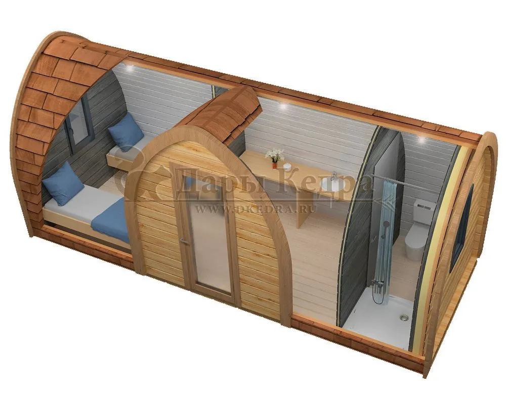 Кемпинг дом изготовлен из хвойных пород древесины. Кровля из мягкой черепицы обеспечивают защиту от осадков.