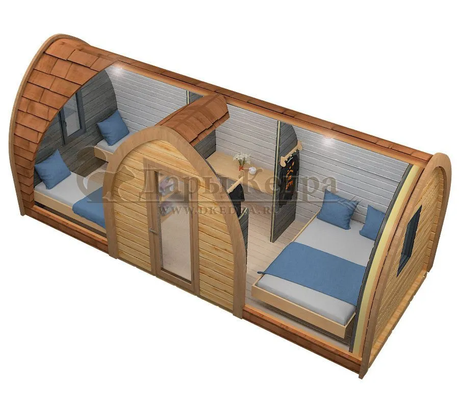 Такой кемпинг дом удобное и практичное решение для дачного использования или обустройства загородных баз отдыха. Увеличенные размеры и боковой вход со стеклянной дверью позволяют зонировать внутреннее пространство помещения. Домик включает в себя: