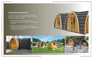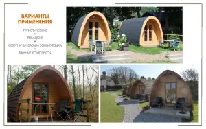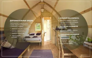 Самый просторный кемпинг дом. Подходит для дачного использования или обустройства загородных баз отдыха. Увеличенные размеры и боковой вход со стеклянной дверью позволяют зонировать внутреннее пространство помещения. Домик включает в себя: