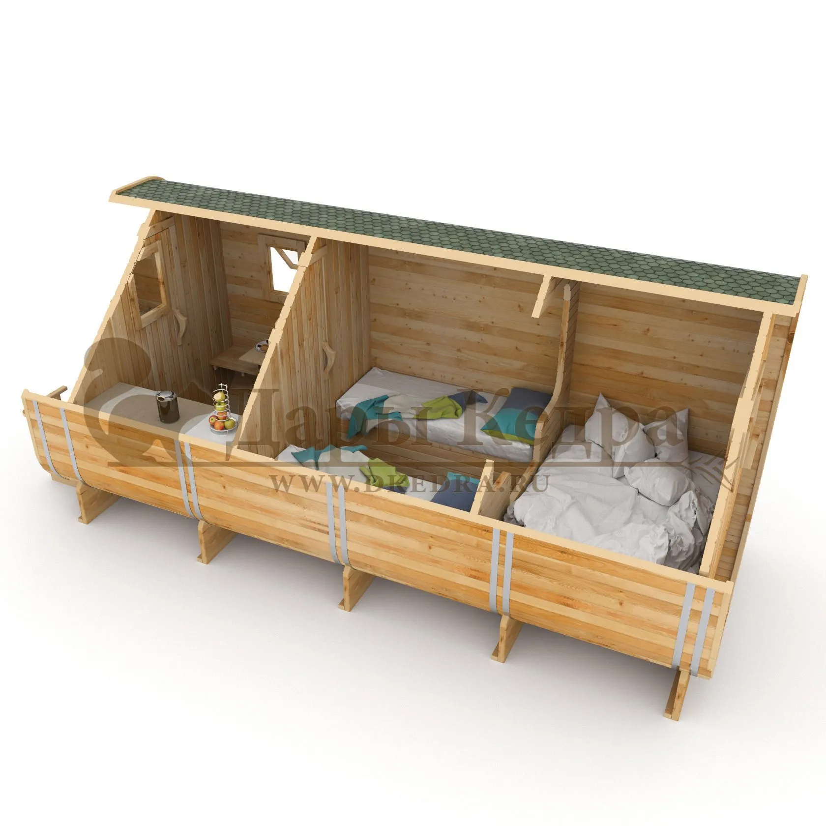 Домик с тремя помещениями подходит для дачного использования в теплое время года или обустройства загородных баз отдыха. Прихожая и кухня занимают одну комнату, в которой стоит стол из кедра. Две другие оборудованы четырьмя деревянными лежаками, по желанию их можно заменить на двуспальные кровати. Либо обустроить санузлом и душевой зоной. Для удобства пользования кемпинг дом можно укомплектовать верандой с лавочками или козырьком.