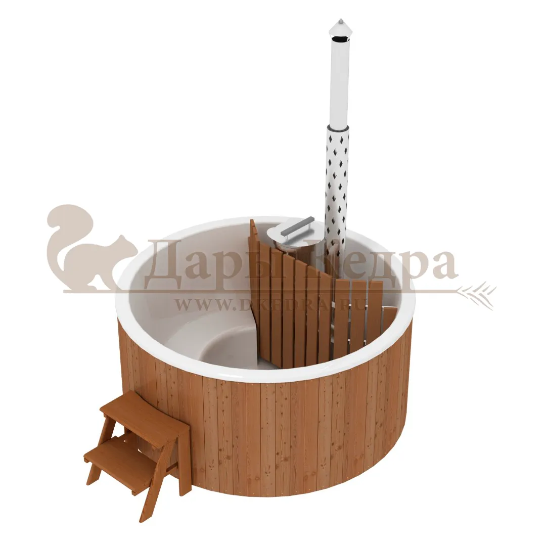 Финская круглая композитная купель с подогревом (с печкой) «Премиум 160 хот с печью 25 квт» Это уличная подогреваемая купель с круглой внутренней чашей, которая изготовлена из современного прочного и термоустойчивого материала (композита). Форма чаши обеспечивает комфортную посадку во время принятия процедур. Для удобства пользования купель оборудована приставной лестницей. Подогрев воды осуществляется внешней печью с дымоходом. Композитная вставка придает купели красивый внешний вид, продлевает срок службы и облегчает уход за изделием. Парение на свежем воздухе – это отличный способ укрепить здоровье и поддержать организм в тонусе.