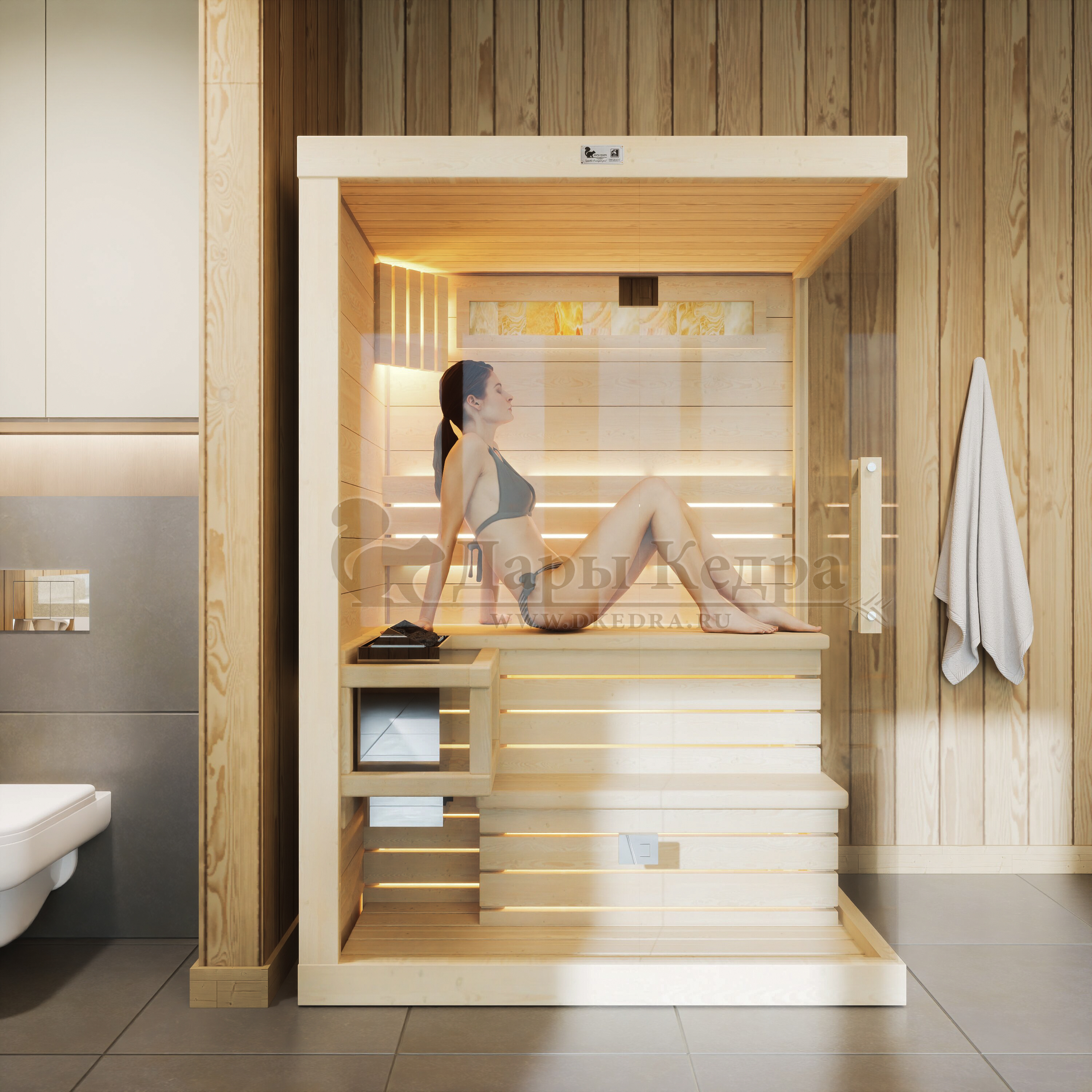 Двухместная прямая финская «Элит» сауна кабина из кедра и липы с электрокаменкой Это специально оборудованная готовая деревянная кабина для сухого и влажного парения. Электропечь нагревает пространство внутри и позволяет сбрызгивать камни водой, слегка увлажняя воздух. Такая процедура позволяет избежать перегрева. Каркас сауны выполнен из массива кедра, снаружи и внутри обшит липовой вагонкой сорта «Экстра» и имеет теплоизоляционный слой. Также двухуровневый полок идёт из кедра для обогащения внутри кабины полезными фитонцидами, а в сочетании с противовирусными свойствами липы сауна становится настоящим источником здоровья. Закаленный цельностеклянный фасад с безрамной дверью является термостойким и придает конструкции легкость и обзорность. Можно добавить боковую стенку, как на образце 3D модели из термостекла за дополнительную плату. Дополнив кабину панелью из гималайской соли или можжевеловым панно с подсветкой вы получаете красивейший объект в интерьере. Финская сауна с электропечью подойдет, как для домашнего использования, так и для коммерции. Доставляется в разборном виде щитами, собирается по инструкции с помощью шуруповёрта.