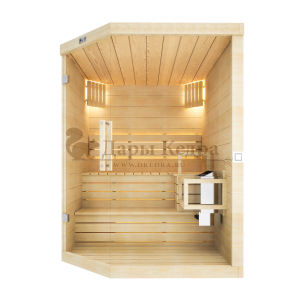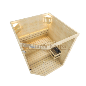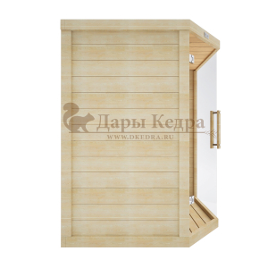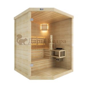 Это специально оборудованная готовая деревянная кабина для сухого и влажного парения. Электропечь нагревает пространство внутри и позволяет сбрызгивать камни водой, слегка увлажняя воздух. Такая процедура позволяет избежать перегрева. Каркас сауны выполнен из массива кедра, снаружи и внутри обшит липовой вагонкой сорта «Экстра» и имеет теплоизоляционный слой. Также двухуровневый полок идёт из кедра для обогащения внутри кабины полезными фитонцидами, а в сочетании с противовирусными свойствами липы сауна становится настоящим источником здоровья.