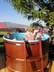 Это уличная подогреваемая купель с круглой внутренней чашей из термопластика. Для удобства пользования купель оборудована лавочками, приставной и внутренней лестницей. Подогрев воды осуществляется за счет внешней печи с дымоходом. Термопластик устойчив к воздействию температур, облегчает уход за фурако и увеличивает срок ее службы.